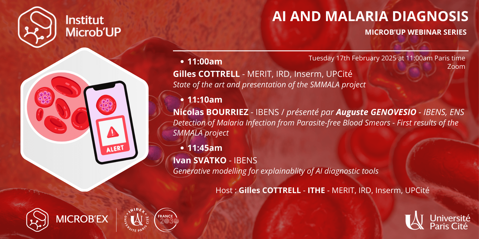 - 11:10am: Nicolas BOURRIEZ – IBENS / Présenté par Auguste GENOVESIO: Detection of Malaria Infection from Parasite-free Blood Smears – First results of the SMMALA project