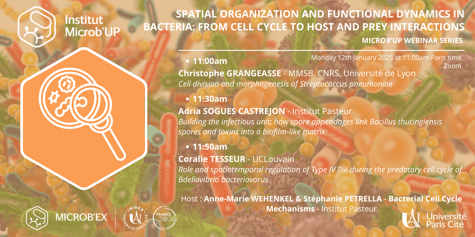 - 11:30am: Adria SOGUES CASTREJON – Institut Pasteur : Building the infectious unit: how spore appendages link Bacillus thuringiensis spores and toxins into a biofilm-like matrix